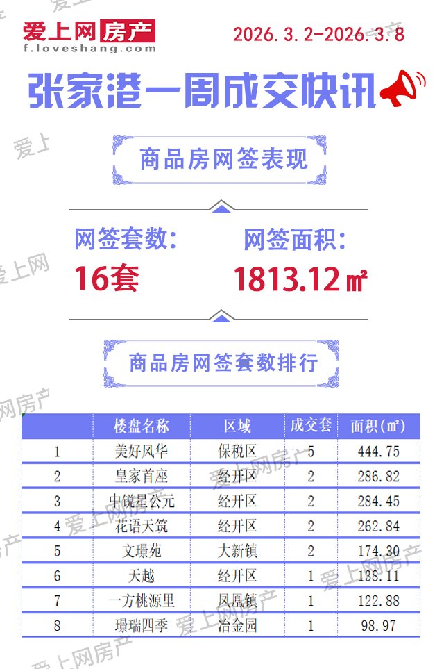 正文摘要:據(jù)張家港愛上網(wǎng)房產(chǎn)統(tǒng)計(jì),2026年3月2日-2026年3月8日,張家港商品房共網(wǎng)簽16套,面積1813.12平方。 |
