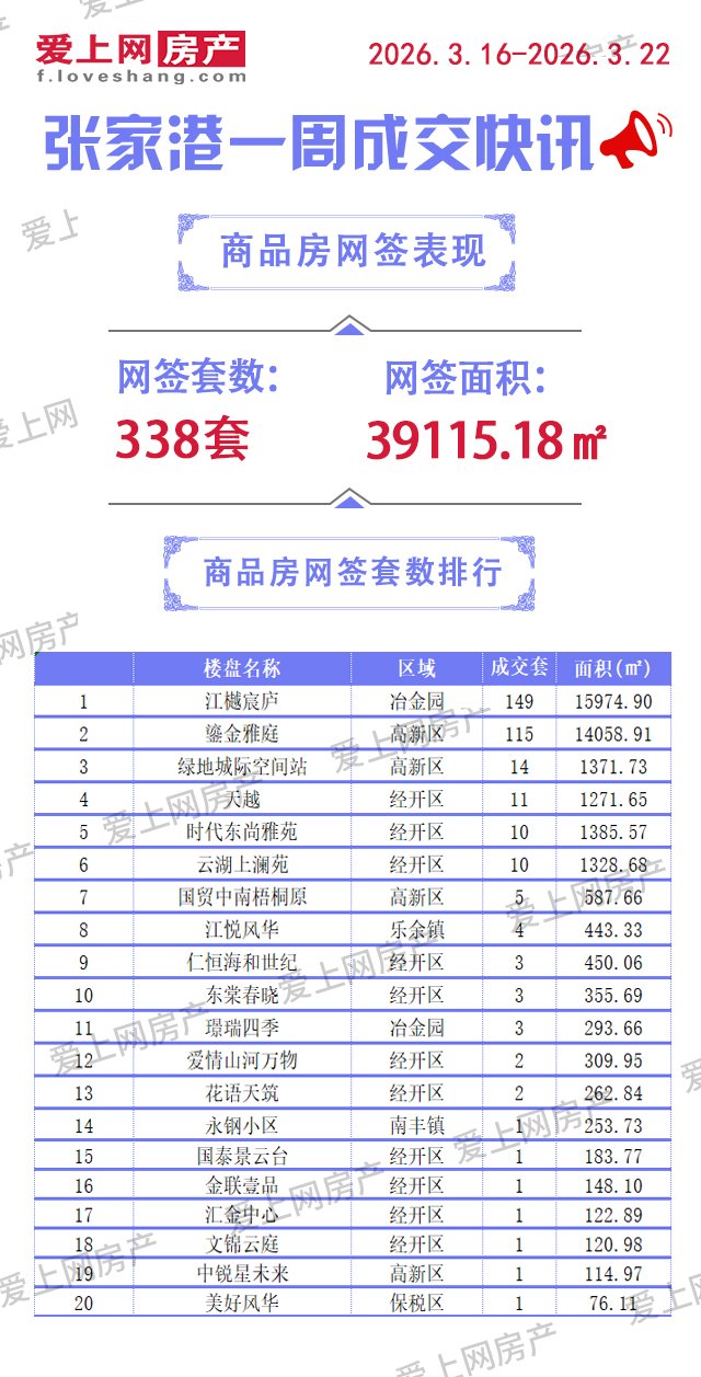 正文摘要:據(jù)張家港愛上網(wǎng)房產(chǎn)統(tǒng)計(jì),2026年3月16日-2026年3月22日張家港商品房共網(wǎng)簽338套,面積39115.18平方米。 |